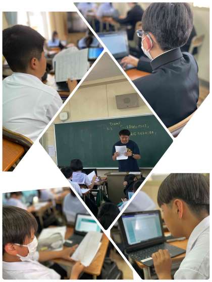 生徒たちは、一人一台端末を使って、学級旗のデザイン案をインターネットで検索しています。