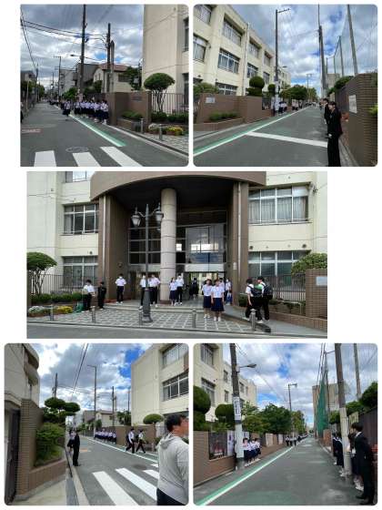 おはようございます。今日の挨拶は、生徒会、合唱部と女子ソフトテニス部です。また、教職員や教育実習生が挨拶や見守りに参加してくれています。