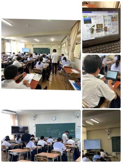 2年4組は社会の授業です。生徒たちが一人一台の端末を使って、検索をしています。プリントの学習作業の時間では、なんとクラッシックの音楽をかけ、生徒たちの集中力を高めています。
