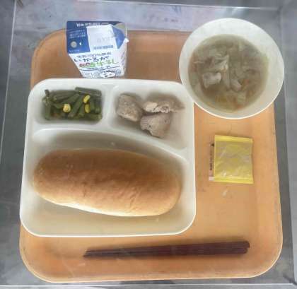 コッペパン、鶏肉のガーリック焼き、スープ、さんど豆とコーンのサラダ、アプリコットジャム、牛乳です。