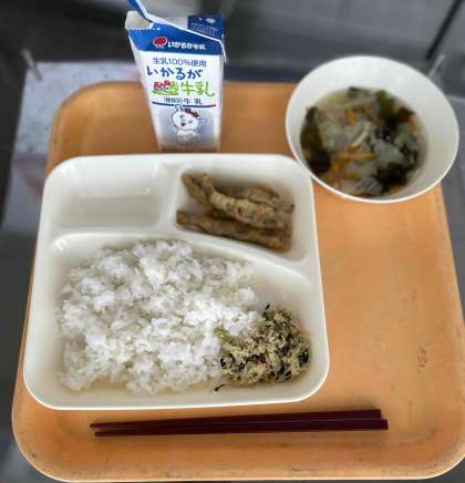 いわしの天ぷら、五目汁、とりなっ菜いため、ご飯、牛乳です。