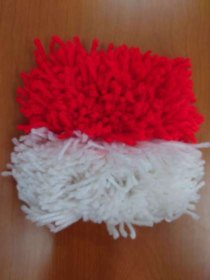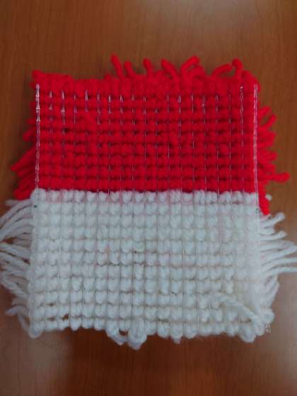 短くカットした毛糸を、メッシュ状のキャンパスに編み込んで、東南アジアにあるインドネシア共和国の国旗をデザインしました。