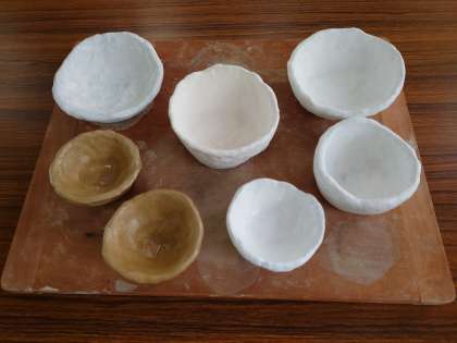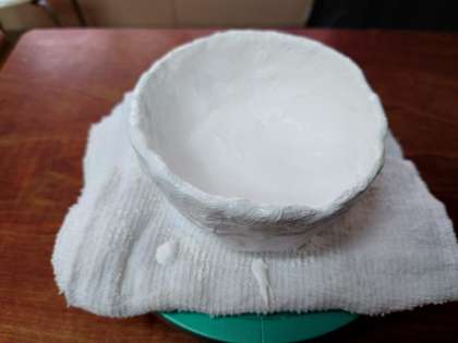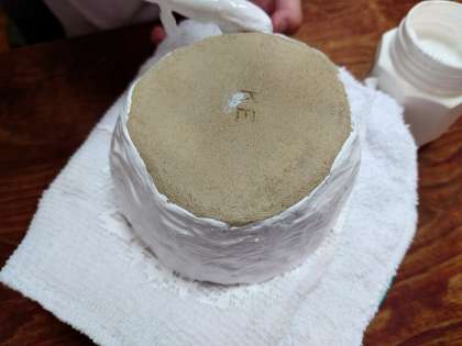 「玉作り成形」後に「素焼き」した陶器を「絵付け」する時、アクリル絵の具が美しく発色するよう、「手回しロクロ」を使って、白色イベントカラーを下地に塗りました。