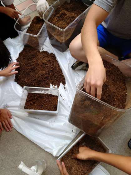 今日は終業式なので、1学期最後に、みんなで飼育ケースの土交換と掃除をしました。