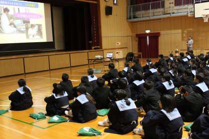 パワーポイントを使った授業で、みがきにくい場所や、どういうみがき方がよいか、歯によい食べ物など、たくさんのことを教えていただき、健康な歯を保つために”規則正しい生活””規則正しい食生活”が大切であることを知りました。