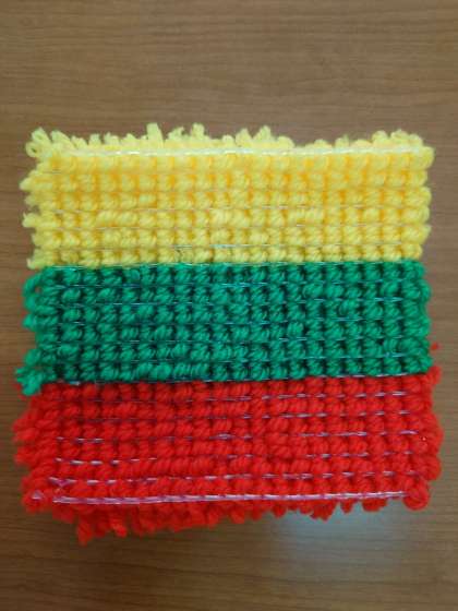 短くカットした毛糸を、メッシュ状のキャンパスに編み込んで、東ヨーロッパにあるバルト三国の一つ、リトアニア共和国の国旗をデザインしました。