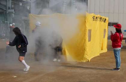 3つのグループに分かれて、可搬式ポンプの操作訓練や初期消火訓練、身近なものを使った応急処置について指導をいただきました。また、火災による煙で周りが見えない中で避難する体験もさせていただきました。