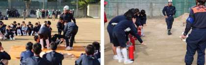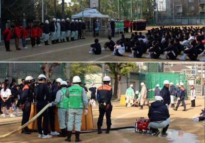12月2日(水)5,6限、運動場で防災訓練を実施しました。阿倍野消防署、阿倍野区役所の方々の他、地域から防災リーダー・女性防火クラブの方々に来ていただきました。