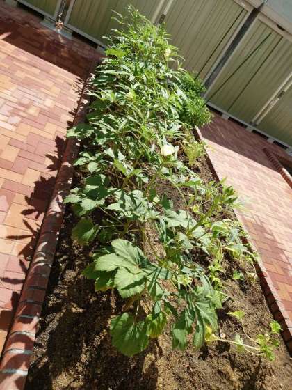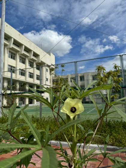 くすのき学級の園芸では、近隣の生活介護事業所「愉笑(ゆら)」さんからオクラの苗を頂きました。みんなで力を合わせて水やりをしてスクスク育てることができました。オクラの美しい花に癒されながら、たくさんのオクラを収穫するのを楽しんでいます。