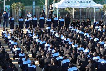 12月7日(月)朝 雲ひとつない青空のもと、全校集会では「第59回府学生科学賞中学生の部最優秀賞大阪市長賞」の栄誉に輝いた2年男子生徒、「大阪市中学校総合文化祭家庭科手芸の部優秀作品」に輝いた3年男子生徒1名、女子生徒7名及び「国税庁・全国納税貯蓄組合連合会主催中学生税についての作文優秀賞」に輝いた3年女子生徒に、校長先生から表彰状が伝達授与され、全校生徒から大きな拍手を受けました。