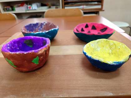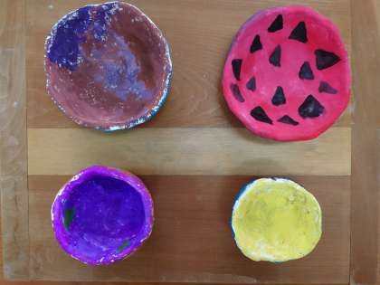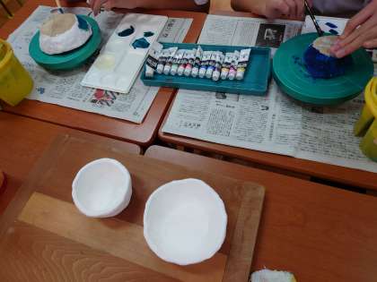 1学期に「成形」して「素焼き」した陶器を、イベントカラーとアクリル絵の具で、「絵付け」しました。