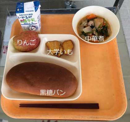 「黒糖パン・牛乳・中華煮・大学いも・りんご」が提供されました。