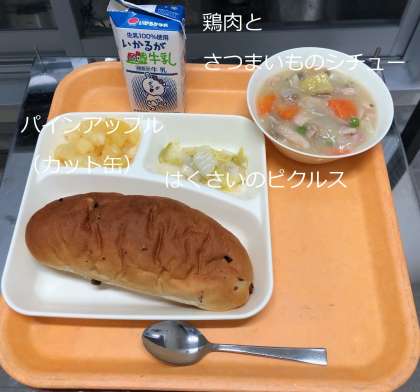 「レーズンパン・牛乳・鶏肉とさつまいものシチュー・はくさいのピクルス・パインアップル(カット缶)」