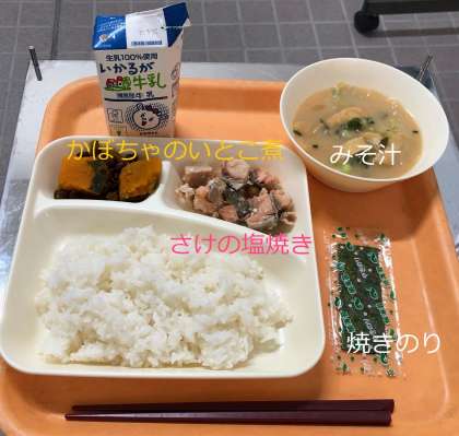 「ご飯・牛乳・さけの塩焼き・みそ汁・かぼちゃのいとこ煮・焼きのり」