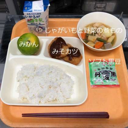 「ご飯・牛乳・みそカツ・じゃがいもと野菜の煮もの・みかん・ソフト黒豆」