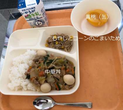 「中華丼・牛乳・もやしコーンのごまいため・黄桃(缶)」が提供されます。
