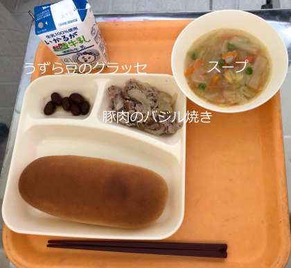 「黒糖パン・牛乳・豚肉のバジル焼き・スープ・うずら豆のグラッセ」が提供されます。