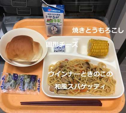 「ミニコッペパン・牛乳・ウインナーときのこの和風スパゲッティ・焼きとうもろこし・固形チーズ」が提供されます。