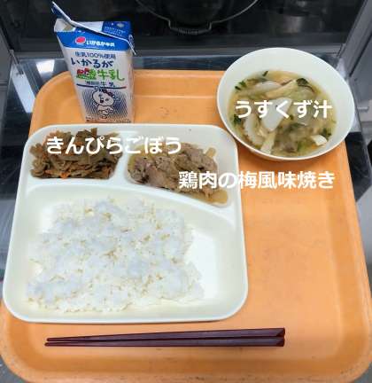 「ご飯・牛乳・鶏肉の梅風味焼き・うすくず汁・きんぷらごぼうが提供されます。