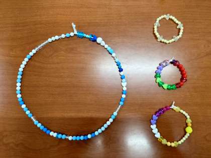 スキルアートで余ったビーズや、その他のキラキラビーズを、タコ糸やオペロンゴム糸に針で通して、結び目をボンドで固めたら完成です。