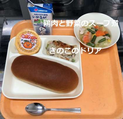 「黒糖パン・牛乳・きのこのドリア・鶏肉と野菜のスープ煮・みかんゼリー」が提供されます。