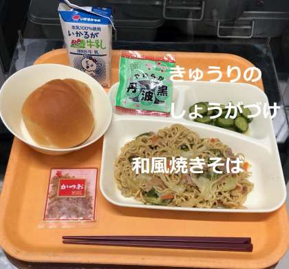 「和風焼きそば・かつおぶし(袋・和風焼きそば)・きゅうりのしょうがづけ・ソフト黒豆」が提供されます。