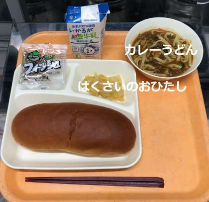 「黒糖パン・牛乳・カレーうどん・はくさいのおひたし・ミニフィッシュ」が提供されます。