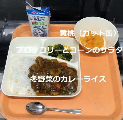 「冬野菜のカレーライス・牛乳・ブロッコリーとコーンのサラダ・黄桃(カット缶)」が提供されます。