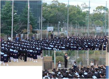 1月7日(木) 3学期の始業式をグラウンドで行いました。どの生徒も冬季休業中にリフレッシュできたのか、爽やかな笑顔でにぎやかに再会を喜んでいました。