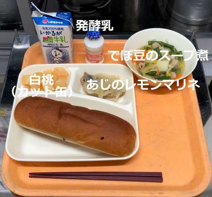 「レーズンパン・牛乳・あじのレモンマリネ・でぼ豆のスープ煮・白桃(カット缶)・発酵乳」が提供されます。