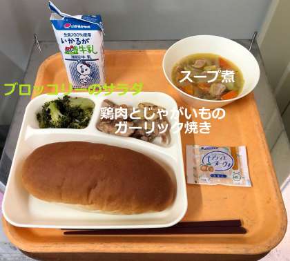 「コッペパン・みかんジャム・牛乳・鶏肉とじゃがいものガーリック焼き・スープ煮・ブロッコリーのサラダ」が提供されます。