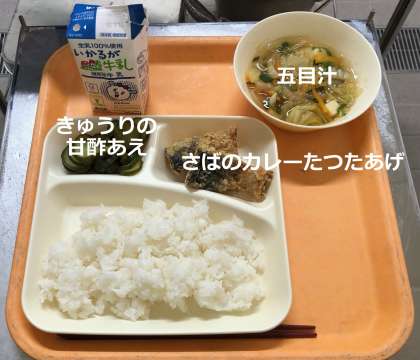 「ご飯・牛乳・さばのカレーたつたあげ・五目汁・きゅうりの甘酢あえ」が提供されます。