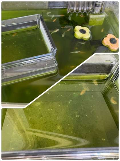 メダカの卵がたくさん孵化して、赤ちゃんメダカがすくすく成長しています。