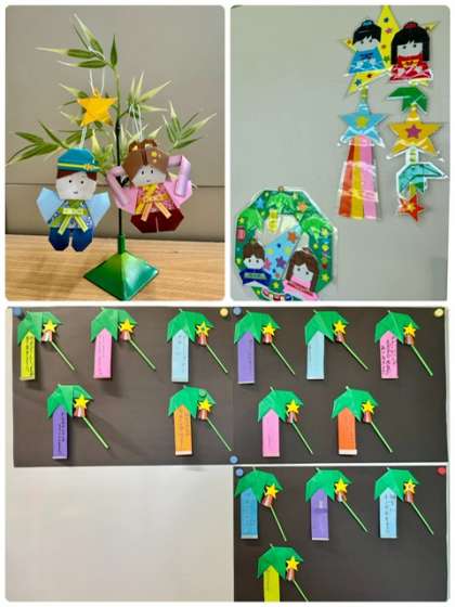 七夕の飾り、願い笹を作りました。 それぞれの願いを短冊に書きました。