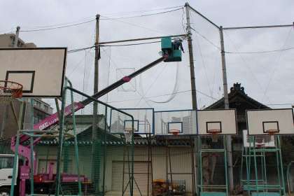 3月7日(月)午前 グラウンドの防球ネットの破損個所について、専門業者にお願いして、修理を行いました。