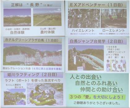 修学旅行は、「自然に親しみ人とのふれあいを通して豊かな心を養う。集団行動を通して相互理解を深め信頼関係を築く。」という目的のもと、5月10日(火)〜12日(木)の二泊三日の日程で、長野県・富山県方面を訪れます。