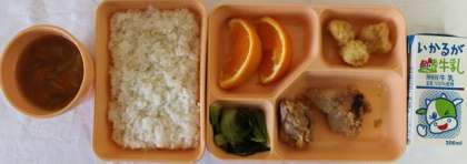 4月15日(金) 給食の献立は、鶏肉のピリ辛焼き・中華煮・いかてんぷら・チンゲンサイの炒めもの・デコポン・米飯・牛乳でした。