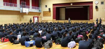 5月10日(火)朝 3年生は体育館で出発式を行い、バス7台に分乗して「修学旅行」に出発しました。