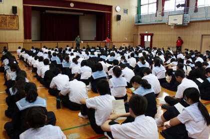 5月11日(水)6限 2年は体育館で、明日の「校外学習(関西サイクルスポーツセンター)」の事前指導を行いました。