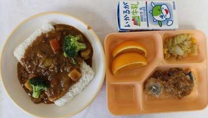 5月13日(金) 給食の献立は、ビーフカレーライス・ブロッコリー、白身魚のムニエル、キャベツのドレッシングあえ、オレンジ、米飯、牛乳でした。(2年生が喫食しました。)