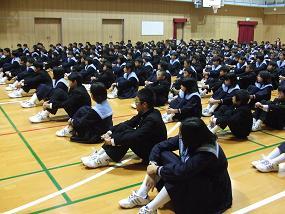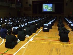 11月8日(金)5限、1年生が防災研修を受けました。阿倍野区役所(安全安心まちづくり)担当の方に来ていただき、「大規模地震のそなえ」と題し、防災についての話を聞きました。