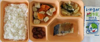5月26日(木) 給食の献立は、さごしのおろしじょうゆかけ・高野どうふの煮もの・ベーコンと野菜の炒めもの・金時豆の煮もの・米飯・牛乳でした。