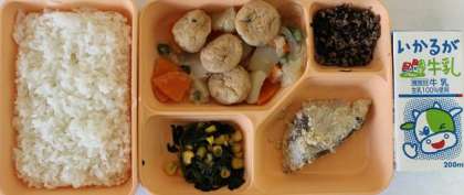 6月2日(木) 給食の献立は、一口がんもとじゃがいもの煮もの・鰹のしょうゆマヨネーズ焼き・ほうれん草とコーンのおひたし・牛ひじきそぼろ・米飯・牛乳でした。
