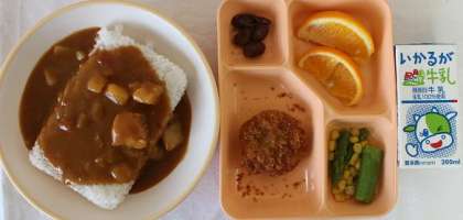 6月8日(水) 給食の献立は、チキンカレーライス・一口とんかつ・グリーンアスパラガスとコーンのソテー・うずら豆のグラッセ・オレンジ・米飯・牛乳でした。