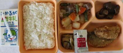 7月5日(火) 給食の献立は、鯵のごま揚げ・鶏肉とじゃがいもの煮もの・焼きなす・小松菜とキャベツのおひたし・米飯・牛乳でした。