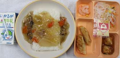 9月2日(金) 給食の献立は、中華丼(えび)・揚げギョーザ・春雨サラダ・あつあげのピリ辛あんかけ・米飯・牛乳でした。