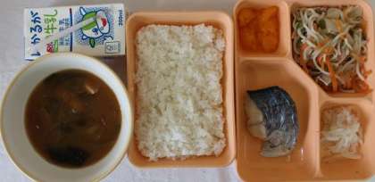 9月5日(月) 給食の献立は、さごしの塩焼き・塩焼きそば・だいこんの酢のもの・みかん缶詰・みそ汁・米飯・牛乳でした。