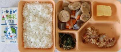 9月6日(火) 給食の献立は、鶏肉の竜田揚げ・一口がんもとだいこんの煮もの・卵焼き・ほうれん草のおひたし・米飯・牛乳でした。