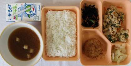 9月9日(金) 給食の献立は、かつ丼(一口とんかつ)・ひじきの煮もの・キャベツの即席づけ・みそ汁・米飯・牛乳でした。