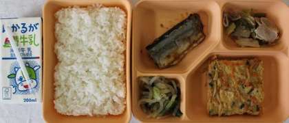 9月27日(火) 給食の献立は、擬製どうふ・秋刀魚のおかか煮・豚肉とキャベツの炒めもの・小松菜とだいこんの即席づけ・米飯・牛乳でした。